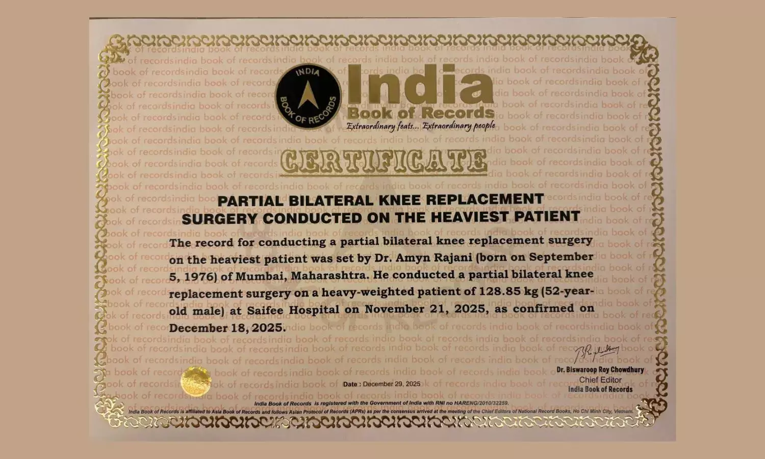 The achievement has now been officially recognised by the India Book of Records. Dr Rajani’s surgery has been recorded under the category “Partial Bilateral Knee Replacement Surgery Conducted on the Heaviest Patient,” after he successfully operated on a 128.85-kg patient at Saifee Hospital, Mumbai. The record was formally confirmed by the India Book of Records in December 2025, acknowledging the case as a rare and extraordinary feat in Indian orthopaedic surgery.