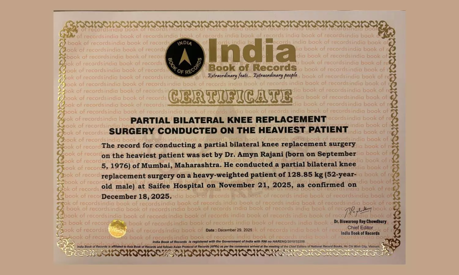 The achievement has now been officially recognised by the India Book of Records. Dr Rajani’s surgery has been recorded under the category “Partial Bilateral Knee Replacement Surgery Conducted on the Heaviest Patient,” after he successfully operated on a 128.85-kg patient at Saifee Hospital, Mumbai. The record was formally confirmed by the India Book of Records in December 2025, acknowledging the case as a rare and extraordinary feat in Indian orthopaedic surgery.